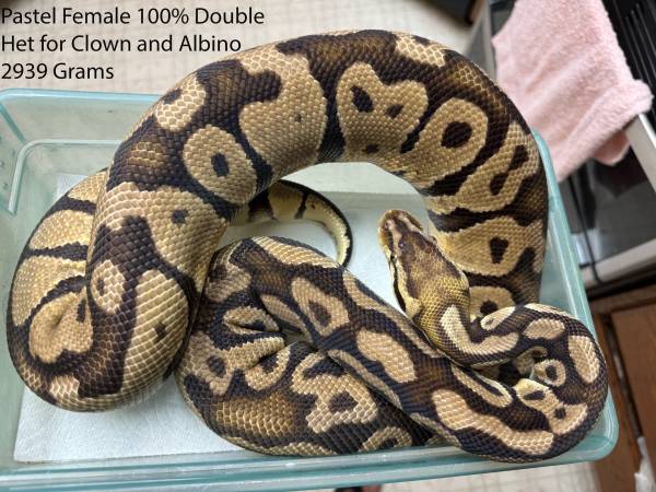 Pastel Female 100% Double Het for both Clown and Albino. Produce pastel albino clowns with this female. 2939 grams - $200