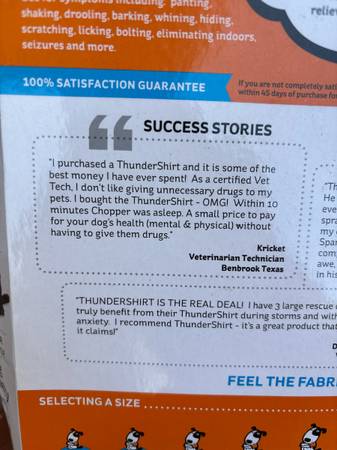 We have a large dog thunder shirt for sale. These are perfect for animals that get scared for the Fourth of July fireworks or if they just have anxiety.