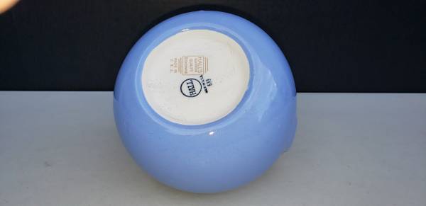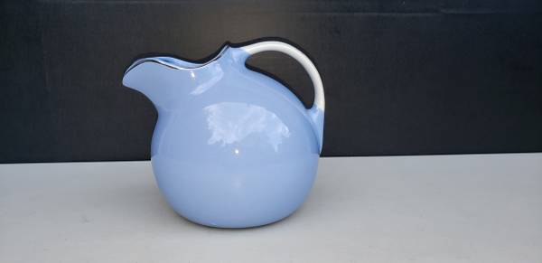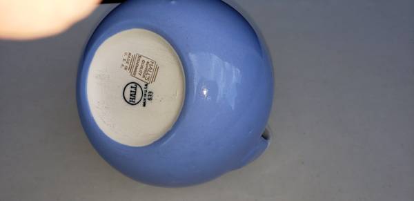 If this listing is posted, the HALL POTTERY “ROYAL ROSE” BALL JUG shown above is available for sale. This wonderful silver trim decorated ball jug No. 633 is cadet blue in color and has a floral decorated white handle. The pattern is Royal Rose produced by The Hall China Company. As can be seen in the photos, the Royal Rose Decal shows on the handle only. This awesome ball jug is in mint-like condition without chips, cracks, or scratches. The glazing is beautiful. The silver trim and handle decoration are flawless. The size of this piece is 6.75” tall, 8” long (spout to handle), by 6.5” wide with a capacity of 64 oz.
