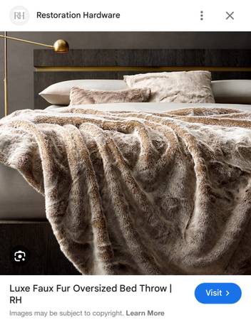 RH Luxe Collection Faux Fur huge throw or Blanket.cream color, last two pictures are the actual throw. Gently used. It has been cleaned . No stains and no smells. looks beautiful in a bed or sofa. For more information please see the pictures. From pet and smoke free home Yes, it’s available. Pottery Barn, Crate and Barrel, Ethan Allen, Neiman Marcus, Arhaus Chairs Anthropologie Restoration Hardware Serena and Lily Bernhardt Henredon Kreiss Arhaus Century Dining Kitchen French Provincial Rustic Antique Ralph Lauren Bed Bedroom Restoration Hardware RH Nigh SoFa Blankets Throws Bed Linen