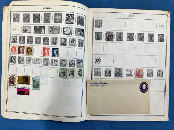 Includes assorted worldwide stamps affixed inside