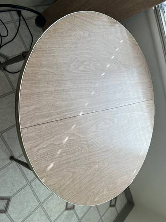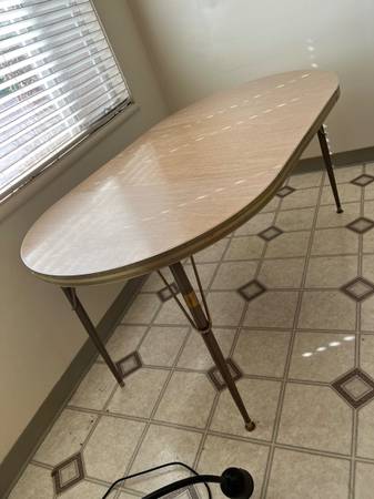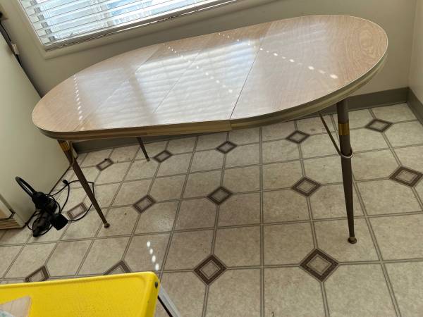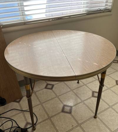 First, is a mid century modern Formica kitchen table with two leaves for $40. There is a small faded rust stain on the table top (see photo). With the two leaves inserted it is approximately 5 feet long. Without the two leaves inserted, it is 35.5” round.