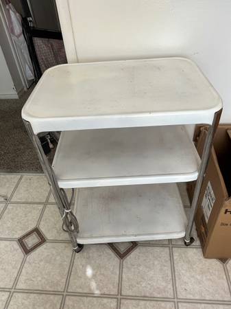 Second, is a retro kitchen cart on casters for $20. The top surfaces has some wear to it. (see photo).