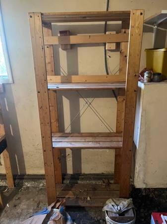 Sturdy wooden storage shelves, ideal for garage, basement, workroom or for organizing a child’s room. Get the first one with two columns for $40, 61” w x 12” d x 67” h. The second one with one column is 30” w x 12” d x 67” h. Get both for $60.