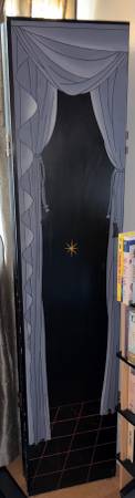 First, is a solid wood 3 panel room divider for $40 with a bookshelf full of books painted on one side, and a starry night viewed through parting curtains on each of the 3 panels on the other side.