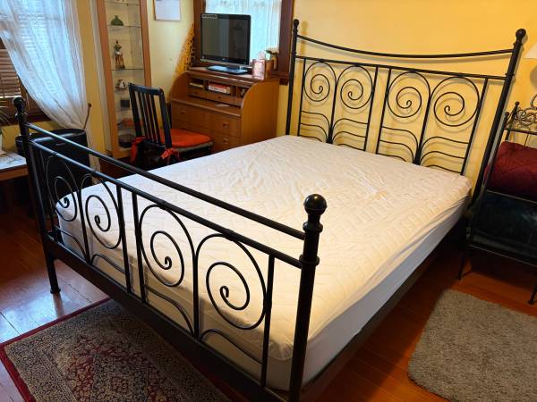 The second bed frame is the black wrought iron frame for $100, $280 with the mattress. Get the matching side table stand for $40, or $300 for the mattress, the black bed frame, and its matching stand.