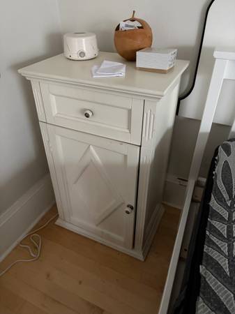 In the first photo presented, is a $100 IKEA Hermes slatted white stained Bed Frame. Behind that Bed Frame, is an ornate decorative headboard for $200. Get this first set up, complete with the Sealy Posturepedic mattress, white Hermes bed frame, and ornate headboard for $450. The two matching white nightstands add $50.
