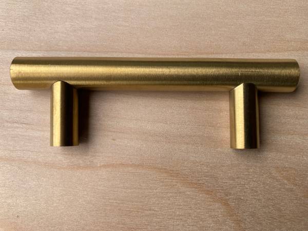 These brushed brass drawer pulls are gorgeous . 17 pieces New in the wrapper with screws 4" wide with 2.5" center ( screw hole to screw hole) Cash sale please !