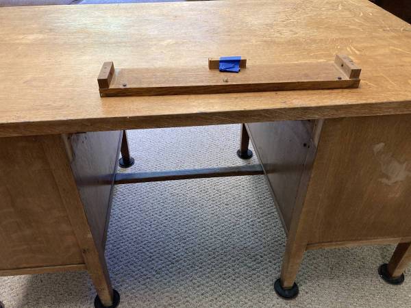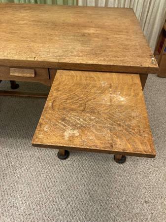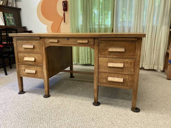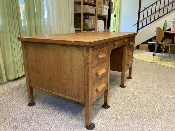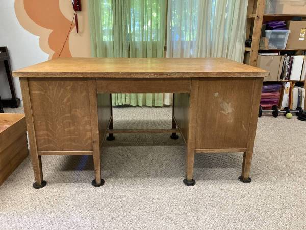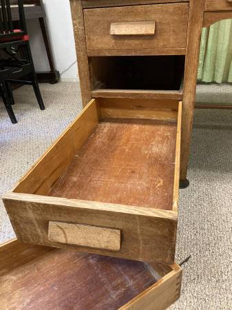 For the lovers of wabi sabi, this antique (~ 1920's era) solid oak teachers desk is a delight. All of the dovetail drawer joints are in excellent, solid condition. The construction and craftsmanship is virtually unparalleled by contemporary manufactured furniture. This desk features a working lock (with key) for the lap drawer. The side drawers both have the functional mechanisms which lock those drawers once the lap drawer is closed & locked--this is fully functional on the right side, whereas in order for the drawers on the left to lock, a simple small metal part needs to be replaced (on the back of the lap drawer, see photo). The drawers are full length (i.e. spanning the full depth of the desk, affording maximum storage).