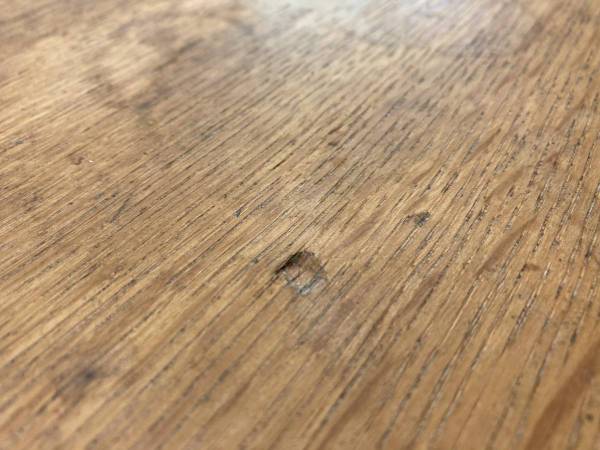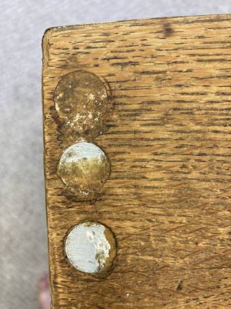 This has been lovingly cleaned with a light touch (using only beeswax & oil finish) to the finish, leaving the wabi sabi marks of its history of use over the generations. (However, this could be fully scraped/stripped and refinished for a fresh look if desired). Thus there are several minor blemishes which add character, rather than detract. The main unfortunate blemishes are three small holes drilled and filled w/ aluminum on the right front corner. These could be re-filled with wood filler & stained/coated if desired.