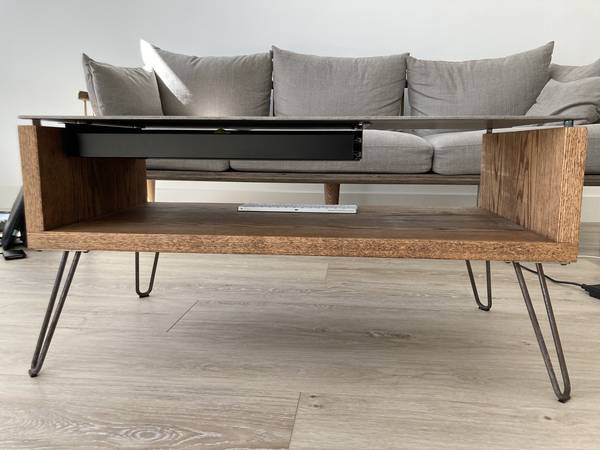 Industrial Style Wood and Floating Steel Top Coffee Table The inside black drawer is not included Materials: Dark Oak and Steel Dimensions:36" L x 18" W x 18" H