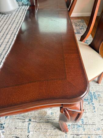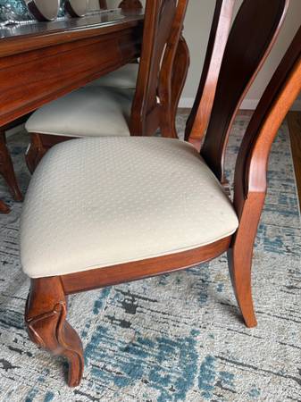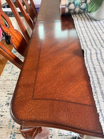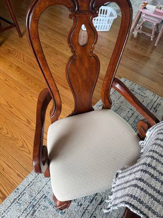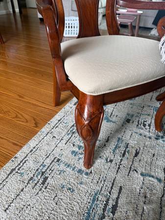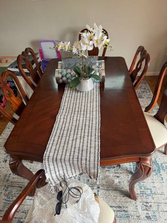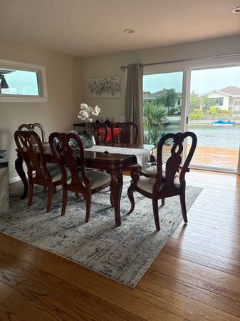 Real natural wood extendable dining room set. Including dining room table that has two removable leaves, eight chairs, including two captain chairs for the end. Use as 4 seats, 6 seats or 8 seats. Excellent condition smoke free pet free home. Dimensions. 44 wide by 70 long without 2 leafs of 12 inch. Paid approximately 2500 and asking 780