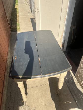 Solid wood dining table and 4 chairs. Black tabletop, white legs, and white chairs. Distressed rustic look. Was $600 new, used for 6 months before we moved and has been in storage. Wooden dowel used to hold up foldable/expansion part of tabletop is missing. Can easily be found in Home Depot or Lowes. Table is solid wood so is heavy. Price firm. First come, first serve.