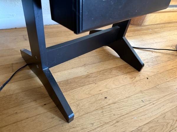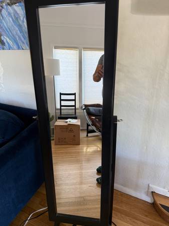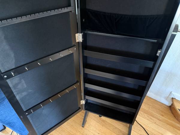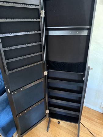 Standing mirror in immaculate condition. Opens to contain a large jewelry case large with enough hooks, earring slots and shelves for a sizable collection. The inside is lined with felt.