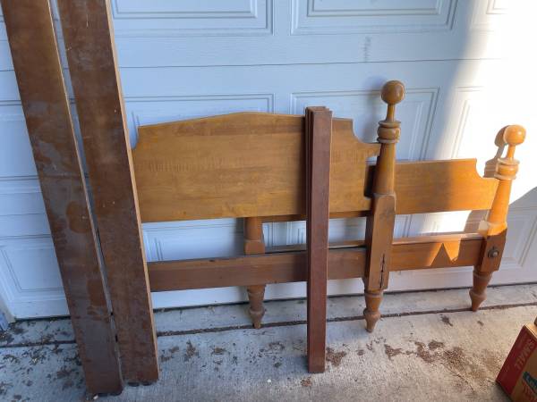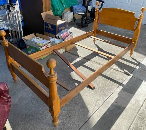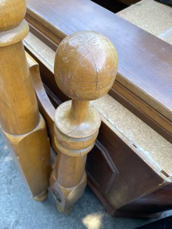 Solid wood Vintage Extra Long Twin bed frame, one of the side rails needs fixing, needs a board, but the bed works. The post are starting to split so if you can fix it you can have it 42.5” W 41.5”...