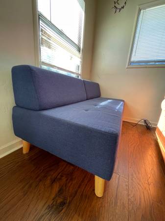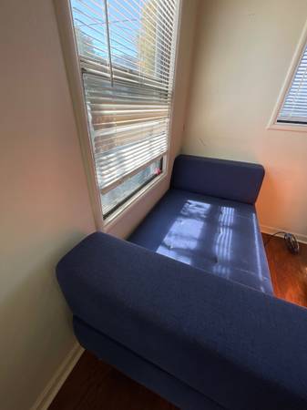 Lightweight dark blue couch with moveable arm or back rest. Can be carried by one person. Quite comfortable and great condition. Sliding scale $60-$70, half of purchase donated to Oakland Animal...