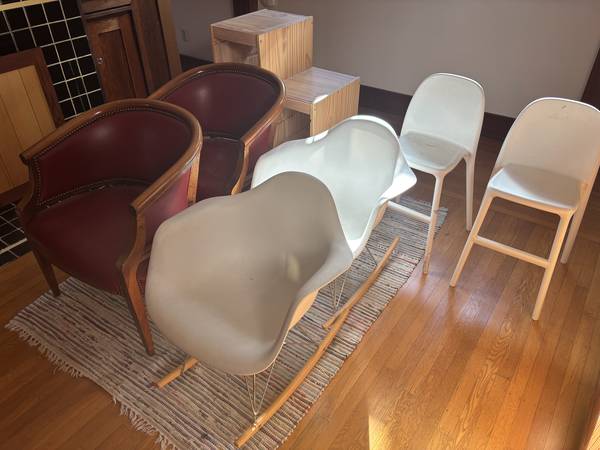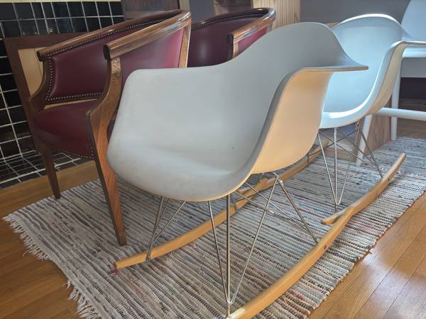 Good condition white plastic Eames knock-off rocking chairs. Very sturdy. I don't recall where we got them, but it would be something like this: https://www.wayfair.com/furniture/pdp/george-oliver-arabia-molded-plastic-rocker-chair-w112913800.html?piid=1870258391