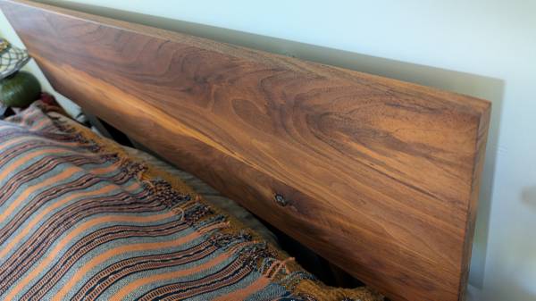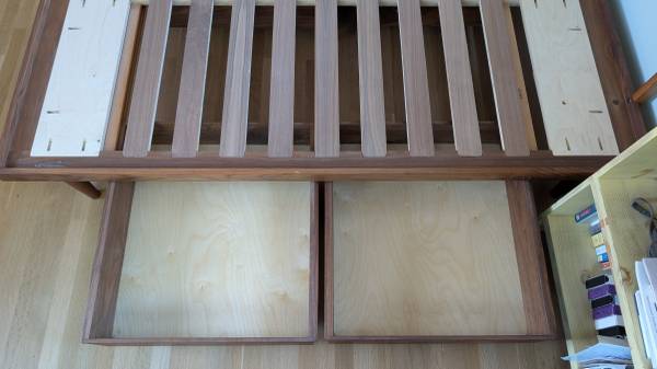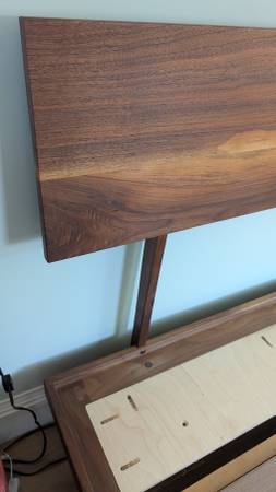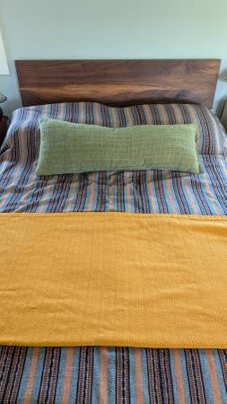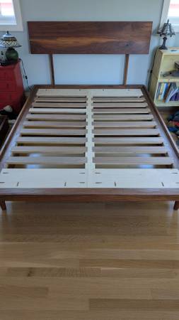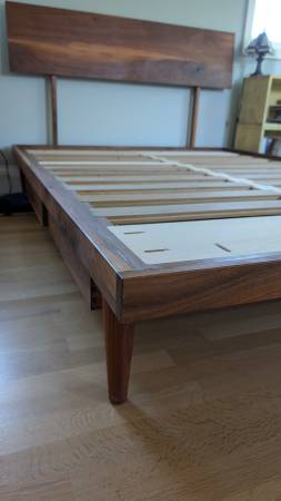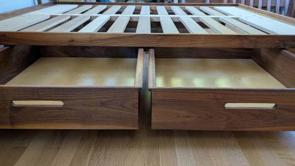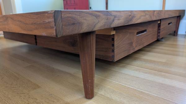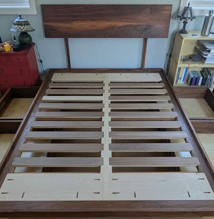 This platform bed frame is made of real walnut and very high quality. Built for a full/double mattress. Made by Pete Deeble (https://petedeeblefurniture.com/) in California and enjoyed for many years. Have moved onto a larger bed/frame and so looking to find a new home for this one. The four drawers underneath the bed hold so much and are great for small spaces!