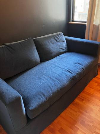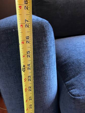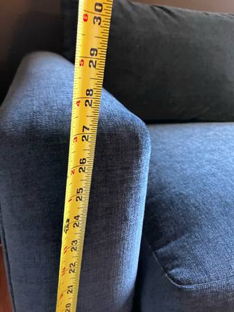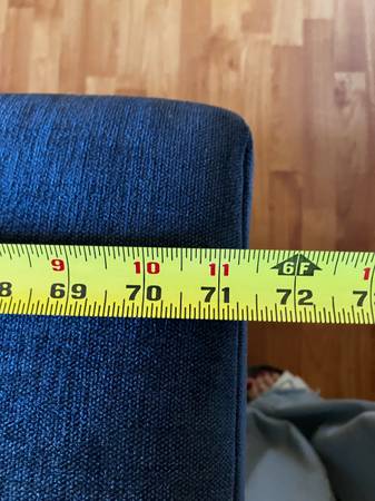 Or best offer. Too big for my studio. This is a sofa that is 71” by 40”, see tape measure in the photo. It’s used but in like new condition except for it got poked on the outer left arm in the fabric ripped a little. It’s 71 inches long. The fabric is blue not dark blue or bright its called indigo. Its sturdy and heavy. Good suspension under cushionse