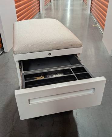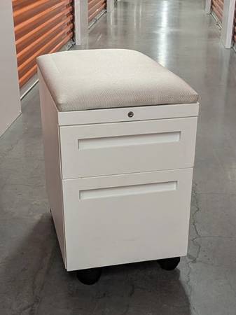 Upholstered Seat (Pedestal) File Cabinets 2 available, $75 each White Metal 2 drawers Bottom drawer fits legal or letter size files - or use for other storage 23 deep X 15" wide X 24" tall Pick up