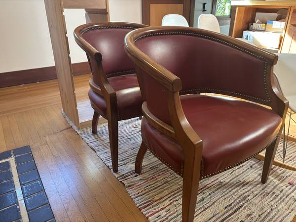 Excellent condition traditional red leather side chairs, with wood frame and legs, and beautiful nailhead trim. At least 50 years old, probably more. Comfortable, sturdy and elegant, great color on the wood. A few small marks on the leather in one spot on one chair. We have moved and no longer have a space for these. I can help load your vehicle if needed.