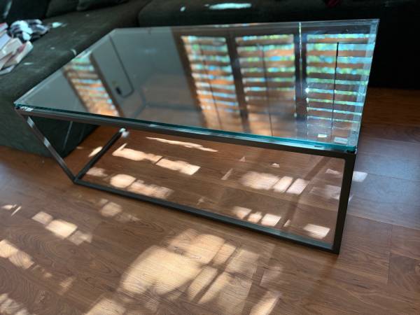 Simple, modern coffee table with a thick glass top and sturdy black metal iron frame. FREE