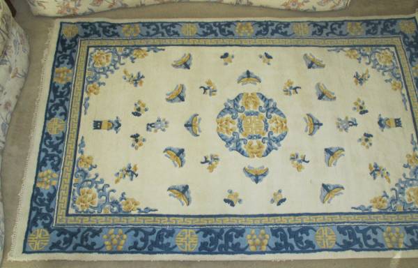 Hand Knotted Canton Wool Rug Ivory background with light blue, dark blue and yellow gold accents. 5 ft 6 in × 8 ft 6 in and 0.75 in thick We purchased the rug in the 1980s and well cared for....