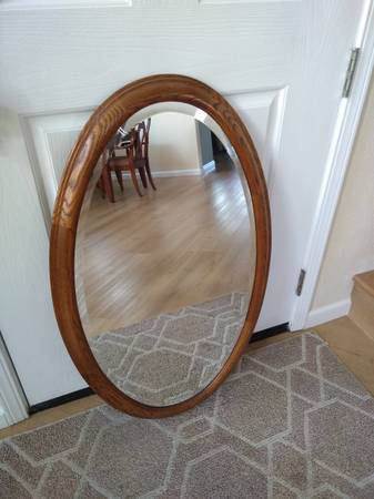 Oval mirror with bevelved edge in solid wood frame. 23" x 37"