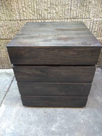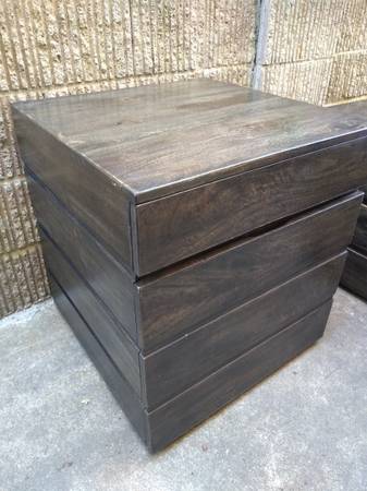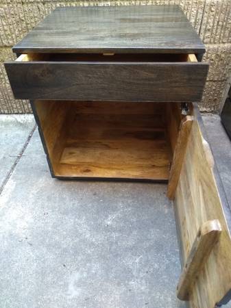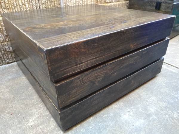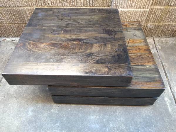 High-end heavy solid wood large coffee table with two matching side tables. The coffee table top slides to extend for more space. The side table features top drawer and bottom cabinet with door. Coffee table measures 34"L x 34"W x 18"H. Side table measures 22"L x 22"W x 24"H. Excellent condition except minor cosmetic wear on coffee table. Purchased price $800