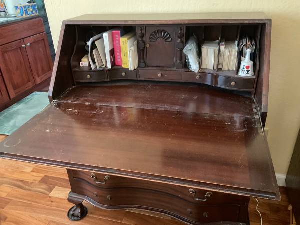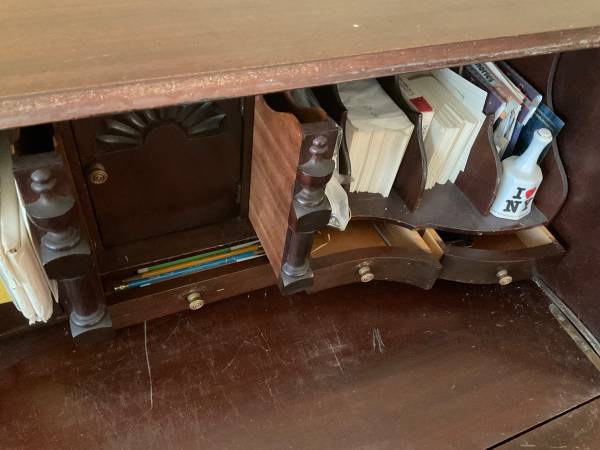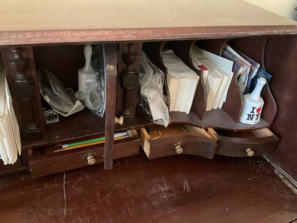 Thank for viewing this very nice antique Secretary in very good condition. It measures 38" wide x 18" deep x 42" tall; the desktop is 29 1/4" off of the floor. Lots of storage spaces! Perfect for a small room, apartment, condo, studio, home office, use as a school or homework desk.