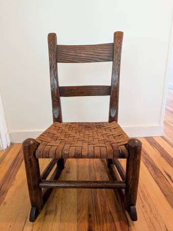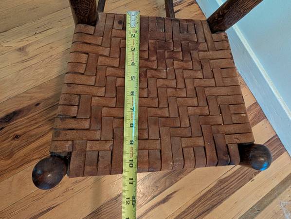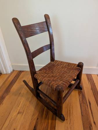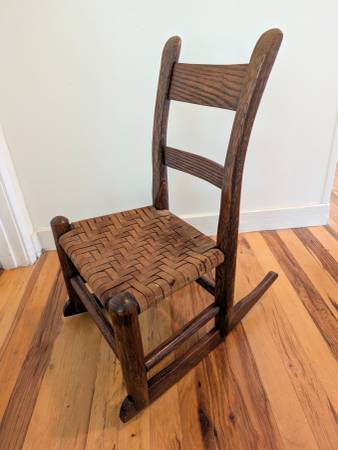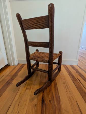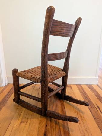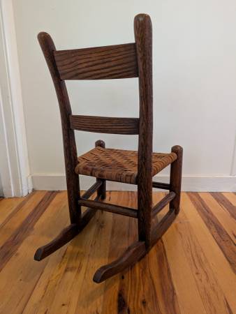 Antique Children's Rocking Chair Ladderback, woven seat. Oak? Unsure. Measurements in photos Cash /. pick up only $125