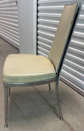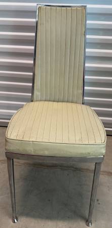 Fun Retro 1960s kitchen/dining chairs with ribbed vinyl seats and backs. Sturdy chrome frames, classic mid-century style.