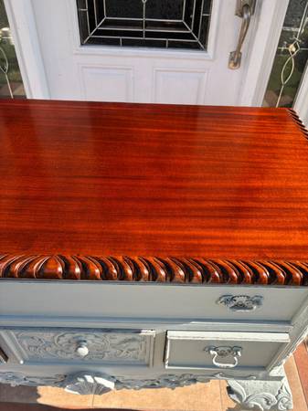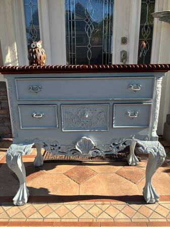 Please include phone number in email for response. Pied crust table. Solid wood, heavy and well built. Can be used at a dresser, night stand or tv stand. Measurements: Height 33” Width 19” Length 36”