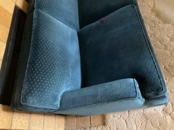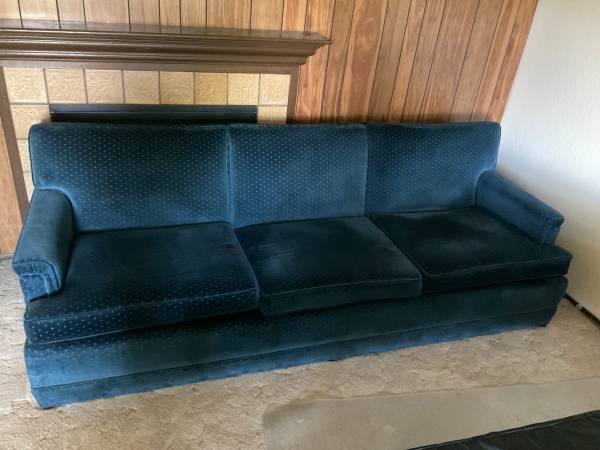 Thank for viewing this clean and odor-free blue sofa from a smoke-free and pet-free home. It is in excellent condition and shows no signs of wear (it had a cover on it). Measures 90" x 32" x 32".