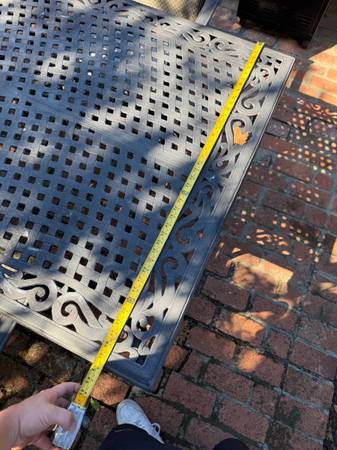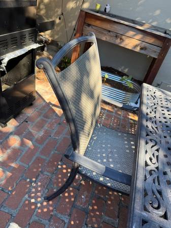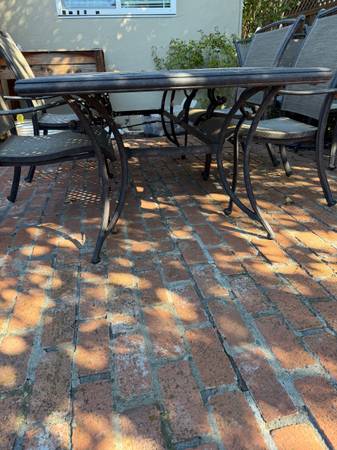 Really nice, beautiful table and chairs. Four of the chairs are still in good shape three of them have tears in the seats. They can be reupholstered or you can find replacement chairs. The whole set was over $2000 new. The table has a painted look to it and is very well-made. The table is right around 7 feet long at 42 inches wide. Can seat 8 to 10 people.