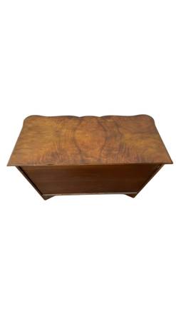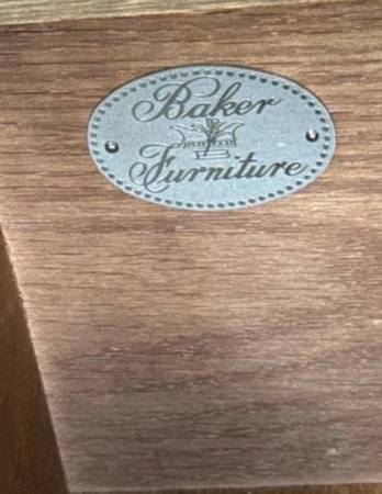 An extraordinary four-drawer commode crafted from richly figured walnut, featuring a classic bombe-front silhouette. Adorned with elegant fold (made in Italy) solid brass drop pulls and a gracefully scalloped top and apron. The design is completed with canted front legs, a scalloped side skirt, and refined back legs- an exceptional example of Baker’s timeless craftsmanship.