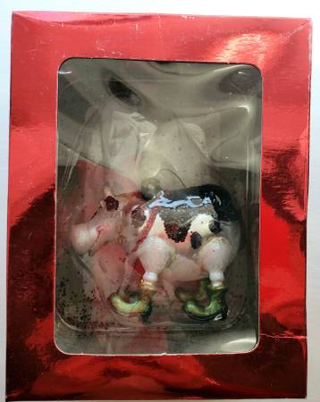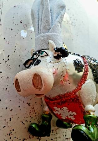New Whimsical Chef Cow Glitter Glass Blown Holiday Hanging Ornament Christmas Tree from Katherine’s Collection - Decorative, Embellished, Hand Painted, Hanging with Glitter. Cow is about 4" long.