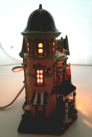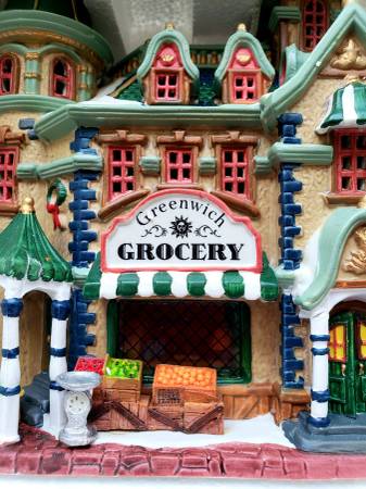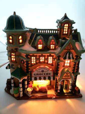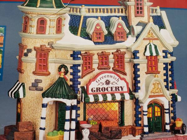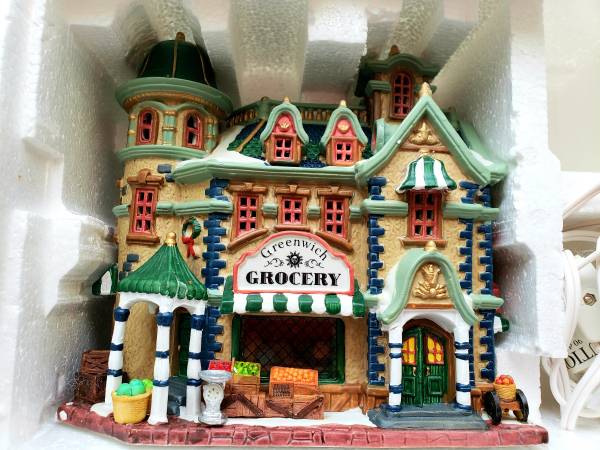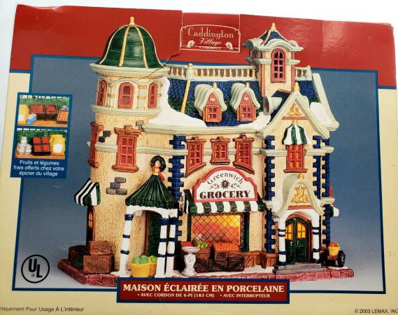 It is a hand-painted Lemax Caddington Victoria Style Village Greenwich Grocery, a lighted porcelain building. It's in a box/packaging.