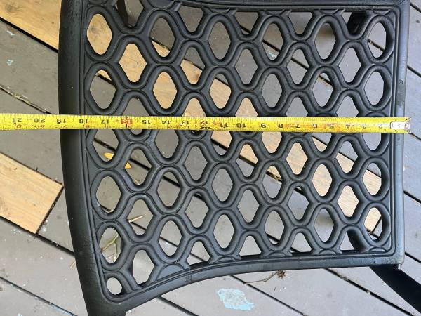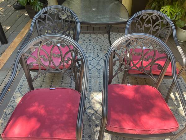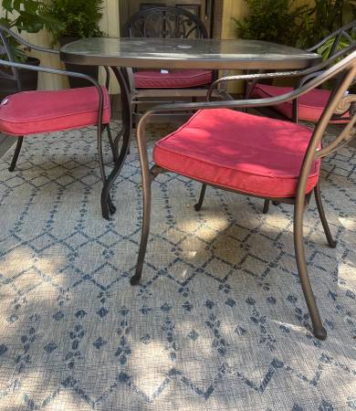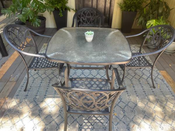 Solid and elegant 42” black square glass table with 4 sturdy 19x23” metal armchairs. Perfect for any garden or patio, this set combines style and durability.