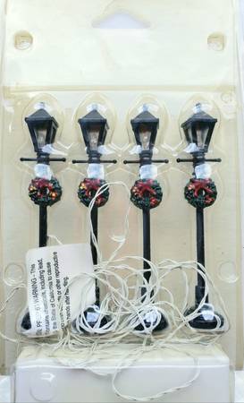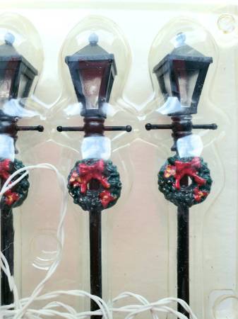 Please contact us for other Christmas Village Display Houses and New Christmas decorations. We have many styles and shapes. This is a set of Lemax Gas Lantern Lighted Black Street Lamps, which are accessories for Christmas village displays and are decorated with festive wreaths.