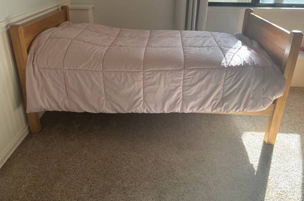 Solid real wood twin frame- headboard, footboard and side rails. Mattress/ box springs/ bedding not included. Smoke/ pet free home, reasonable offers considered. Delivery possible for additional...