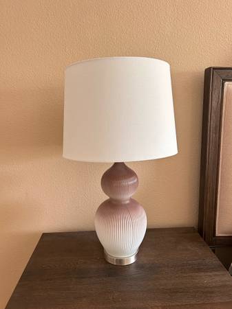 Add a touch of sophistication to your space with this beautiful pair of glass table lamps. Each lamp features a sculpted, ribbed glass base in a soft gradient of warm taupe and white, complemented by a simple white linen shade that diffuses light beautifully.