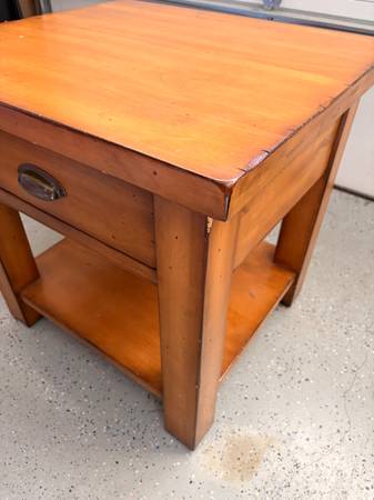 Pottery Barn Solid Wood Side Table with drawer Dimensions are 26" wide (side to side), 24" deep (front to back) and 25" height.