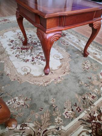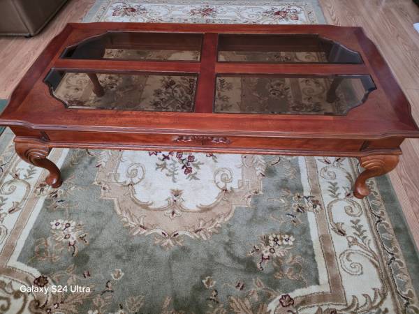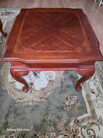 Elegant cherry color wooden coffee table with sectional glass top. 54"x 26"x17 High. End table with solid wood top. 26"x 24" x 21 High. Heavy solid wood. Minor scratches. Both $100 firm. If you read...