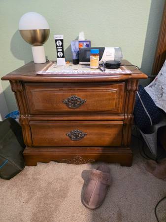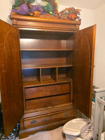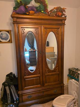 This is a wonderful 4-piece vintage style set, and for the price you would pay for just the bed. It is in good condition as we have had it a long time. Dresser has lots of storage with 11 drawers and Armoire also has lots of storage. Note, the rails can be adjusted to fit a Cal king mattress. Does not include the mattress, box springs, pillows or comforter.