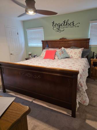 Vintage style King headboard, footboard and rails. Also nightstand, dresser with mirror and marble piece in the middle and Armoire. Note that items on the bed, dresser, nightstand and reflected in the pictures are not included.