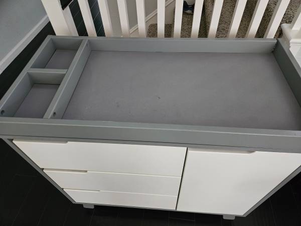 Good condition - one screw loose on changing table but otherwise perfectly usable. See pics. Specs: https://babyletto.com/products/hudson-3-drawer-changer-dresser-with-removable-changing-tray