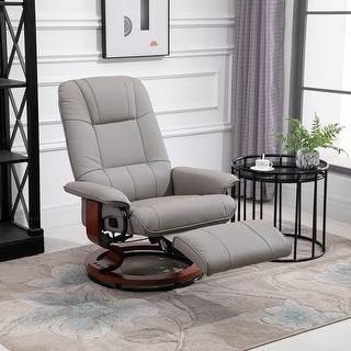 This gray HomCom swivel base recliner chair features plush padding, an ergonomic design, round, wooden 360 degree swivel base so you can swivel and recline smoothly without wobbling around and a reclining leg rest. The faux leather is comfortable and easy to clean and maintain. Swivel and recline up to 145 degrees with the extendable footrest. This recliner is perfect for home and office lounging.