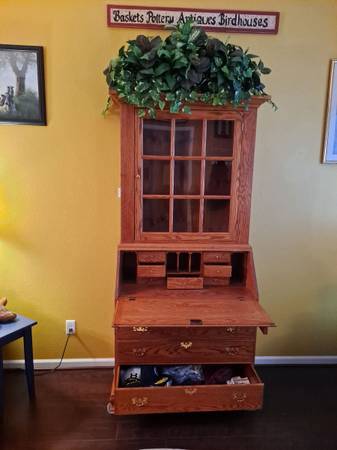 UNIQUE 9-PANEL SOLID OAK SECRETARY DESK AND SEPARATE BOOKCASE. TWO PIECE. FROM TOM SEELY COLLECTION OF WEST VIRGINIA. HARD TO FIND THIS QUALITY. ORIGINAL OWNER. LIKE - NEW CONDITION. 83"H X 39 5/8"W...