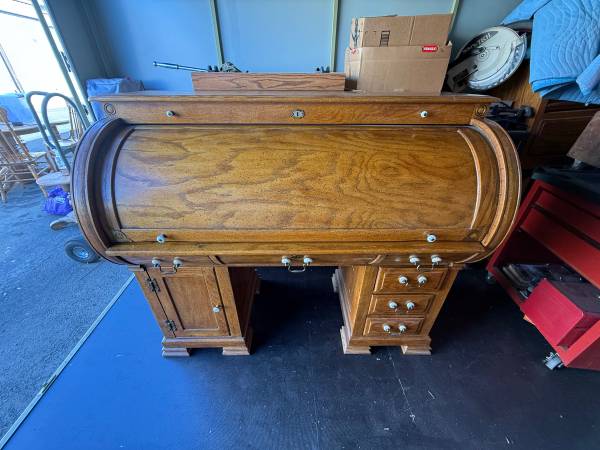Beautiful vintage roll-top desk made of solid oak. A classic piece with elegant craftsmanship, perfect for home offices, collectors, or anyone who appreciates traditional furniture.